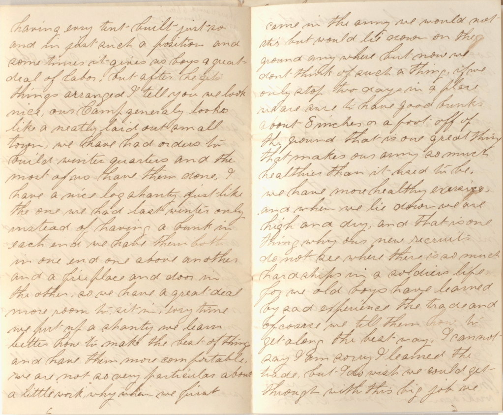 We have had orders to build winter quarters and the most of us have them done. I have a nice log shanty just like the one we had last winter only instead of having a bunk in each end, we have them both in one end, one above another, and a fireplace and door in the other so we have a great deal more rom to sit in. Every time we put up a shanty, we learn better how to make the best of things and have them more comfortable. We are not so particular about a little work. Why when we first came in the army we would not stir but would lie down in the ground anywhere. But now we don’t think of such a thing. If we only stop two days in a place, we are sure to have good bunks about 8 inches or a foot off of the ground. That is one great thing that makes our army so much healthier than it used to be—we have more healthy exercise, and when we lie down, we are high and dry. And that is one thing why our new recruits do not see where there is so much hardships in a soldier life for we old boys have learned by sad experience the trade, and of course we tell them how to get along the best way. I cannot say I am sorry I learned the trade, but I do wish we could get through with this big job we have on hand. I don’t think I should work at it again very soon. I should like very much to try something else.