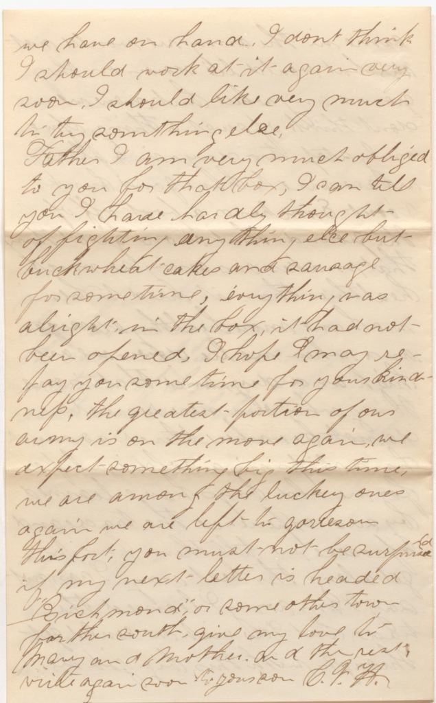 Father, I am very much obliged to you for that box. I can tell you I have hardly thought of fighting or anything else but buckwheat cakes and sausage for some time. Everything was alright in the box. It had not been opened. I hope I may repay you some time for your kindness.