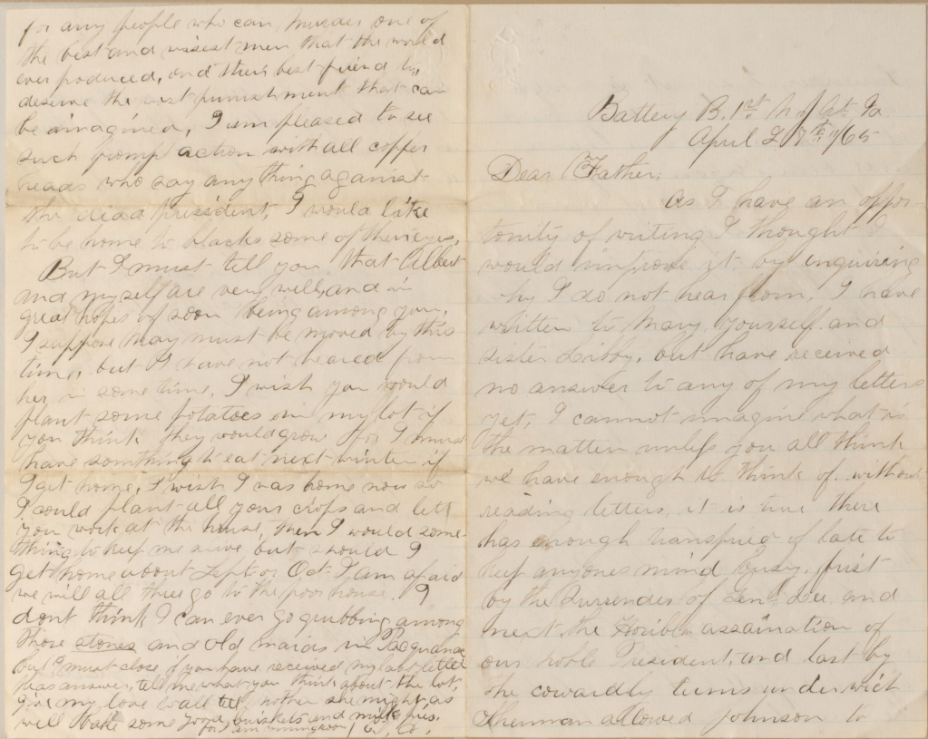 As I have an opportunity of writing, I thought I would improve it by inquiring why I do not hear from you. I have written to Mary, yourself, and sister Libby, but have received no answer to any of my letters yet. I cannot imagine what is the matter unless you all think we have enough to think of without reading letters. It is true there has enough transpired of late to keep anyone’s mind busy, first by the surrender of General Lee, and next the horrible assassination of our noble President, and last by the cowardly terms under which Sherman allowed Johnson to surrender. I say it is enough to keep our minds busy and it ought to keep our hands and bodies agoing to ferret out the cause of Sherman’s [?] actions.