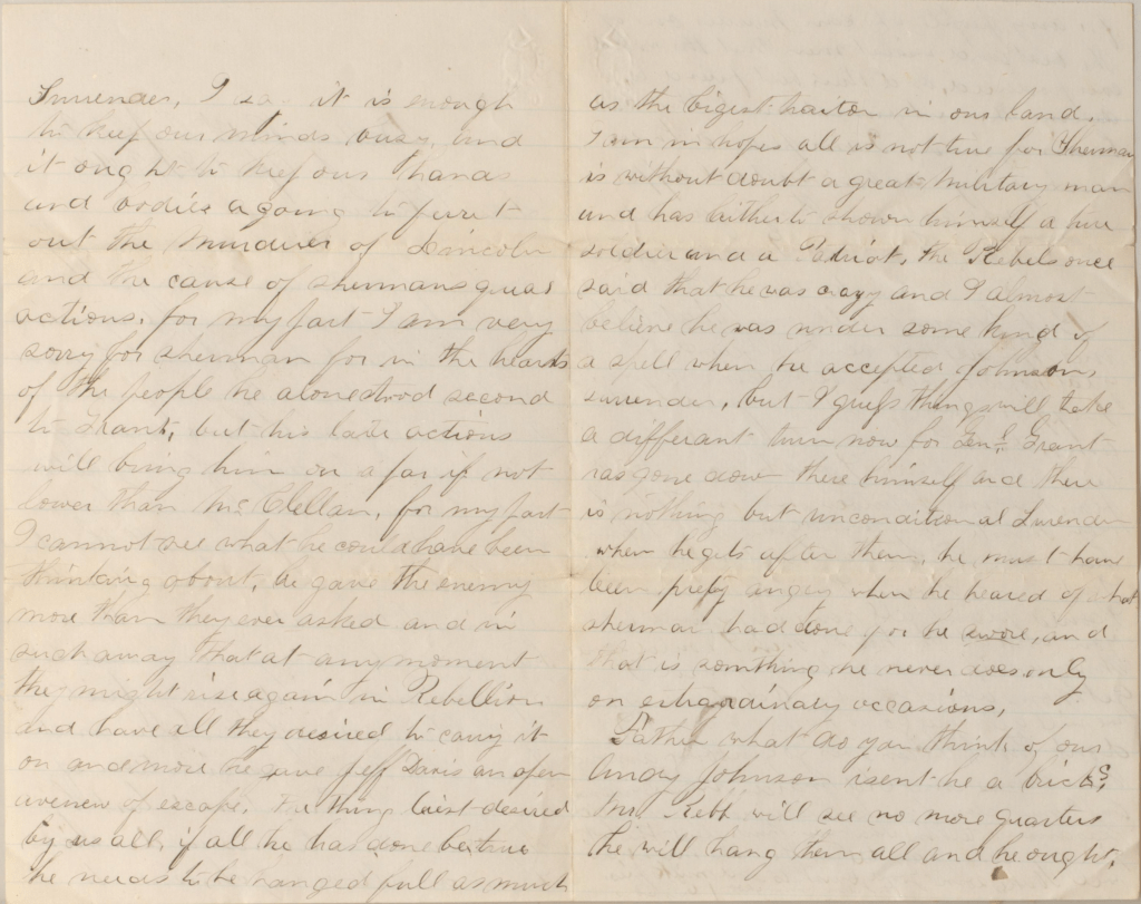 For my part, I am very sorry for Sherman, for in the hearts of the people he alone stood second to Grant, but his late actions will bring him on a par, of not lower, than McClellan. For my part I cannot see what he could have been thinking about. He gave the enemy more than they ever asked and in such a way that at any moment they might rise again in rebellion and have all they desired to carry it on. And more, he gave Jeff Davis and open avenue of escape—the thing least desired by us all. If all he has done be true, he needs to be hanged full as much as the biggest traitor in our land. I am in hopes all is not true for Sherman is without doubt a great military man and has hitherto shown himself a true soldier and a patriot. The Rebels once said that he was crazy and I almost believe he was under some kind of a spell when he accepted Johnson’s surrender. But I guess things will take a different turn now for General Grant has gone down there himself and there is nothing but unconditional surrender when he gets after them. He must have been pretty angry when he heard of what Sherman had done for he swore, and that is something he never does—only on extraordinary occasions.