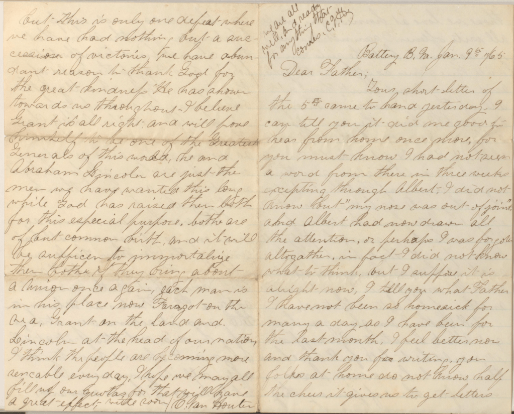 I believe Grant is all right and will prove himself to be one of the greatest generals of this world. He and Abraham Lincoln are just the men we have wanted this long while. God has raised them both for this special purpose. Both are of but common birth and it will be sufficient to immortalize the both if they bring about a Union once again. Each man is in his place now—Farragut on the sea, Grant on the land, and Lincoln at the head of our Nation. I think the people are becoming more sensible every day. I hope we may all fill up our quotas for that wil have a great effect.